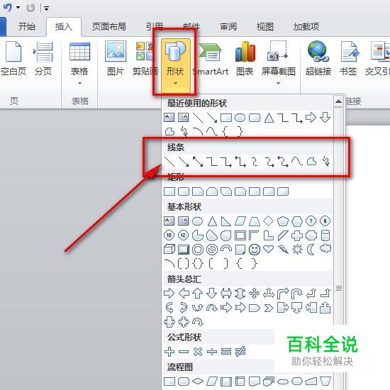 在形状的下拉菜单里,有“线条”这个选项,我们点一下第一个直线图标。