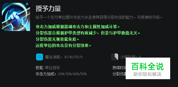 授予力量是猛犸的主动buff技能,能让自己或者友方英雄提高攻击力并获得分裂攻击效果。