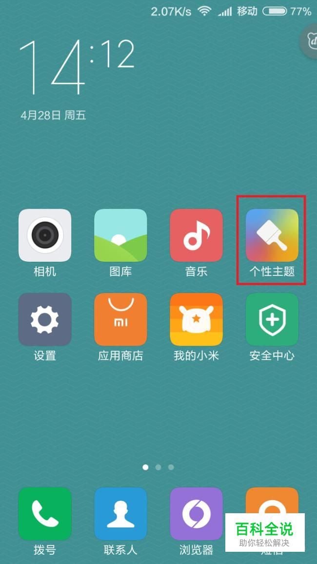 小编这里以小米手机为例,首先在桌面上点击“个性主题”。