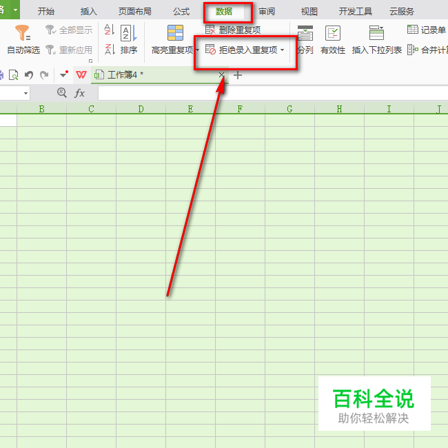 然后点击“数据”菜单下的“拒绝录入重复项”。
