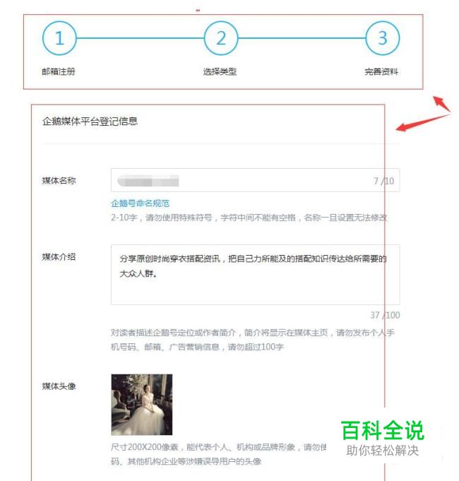 打开并注册企鹅自媒体页面,如下是进入第二步流程中,在此窗口中按照提示把此页面的信息填写完整;此页面的信息比较多同时也比较重要,这里在填写与上传的时候要注意相关的明细要求。