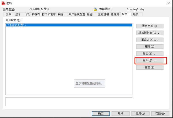 6、如果cad没有自带的“Autocad经典”模式,可以点击【配置】,选择“输入”,导入“Autocad经典”模式文件,并置顶