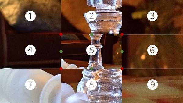 中间的图(图5)的缩放中心位于中心位置,四个对角上的图(图1、3、7、9)的缩放中心分别是靠近大图中心位置的各自的顶点上(红点),剩余的上下左右四幅图(图2、4、6、8)的缩放中心则分别是靠近大图中心位置的各自边上的中点(绿点)。