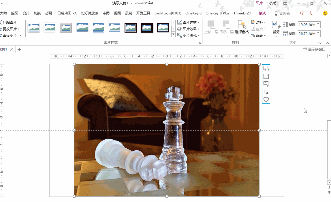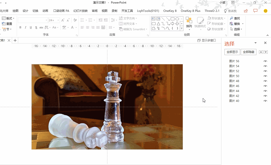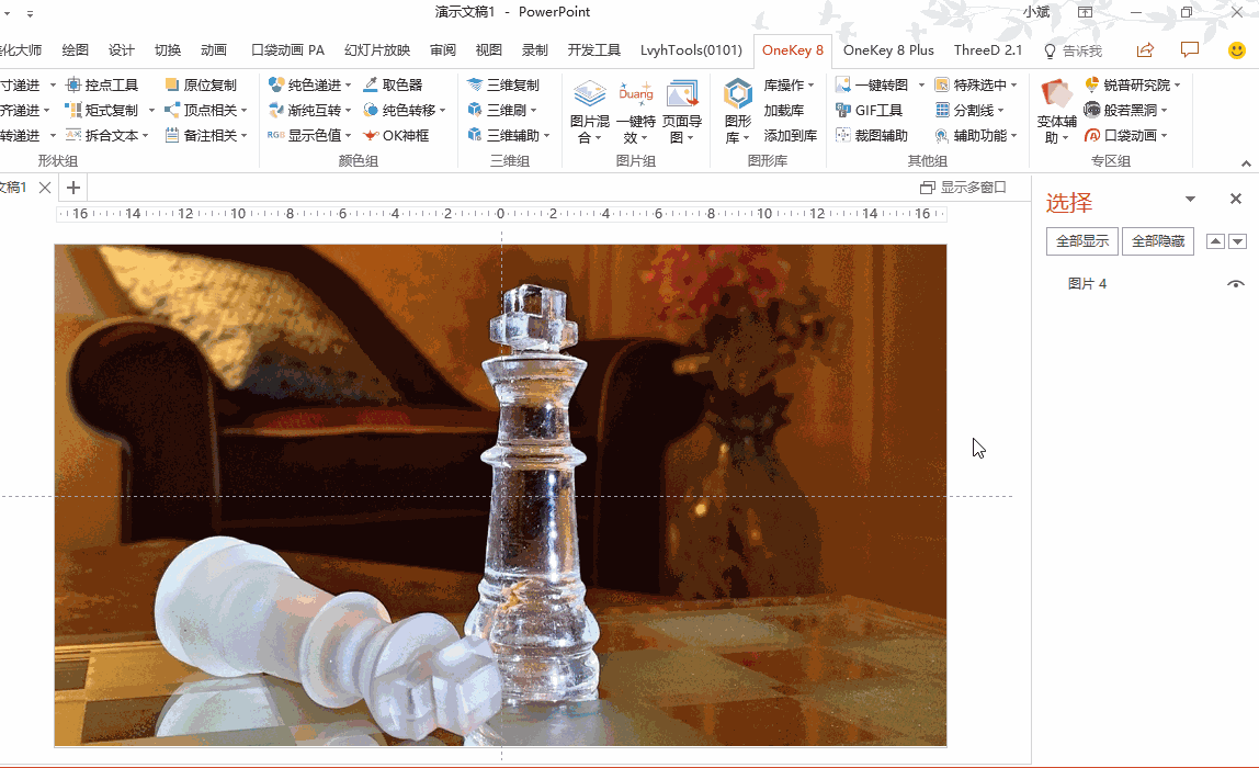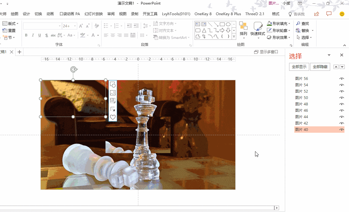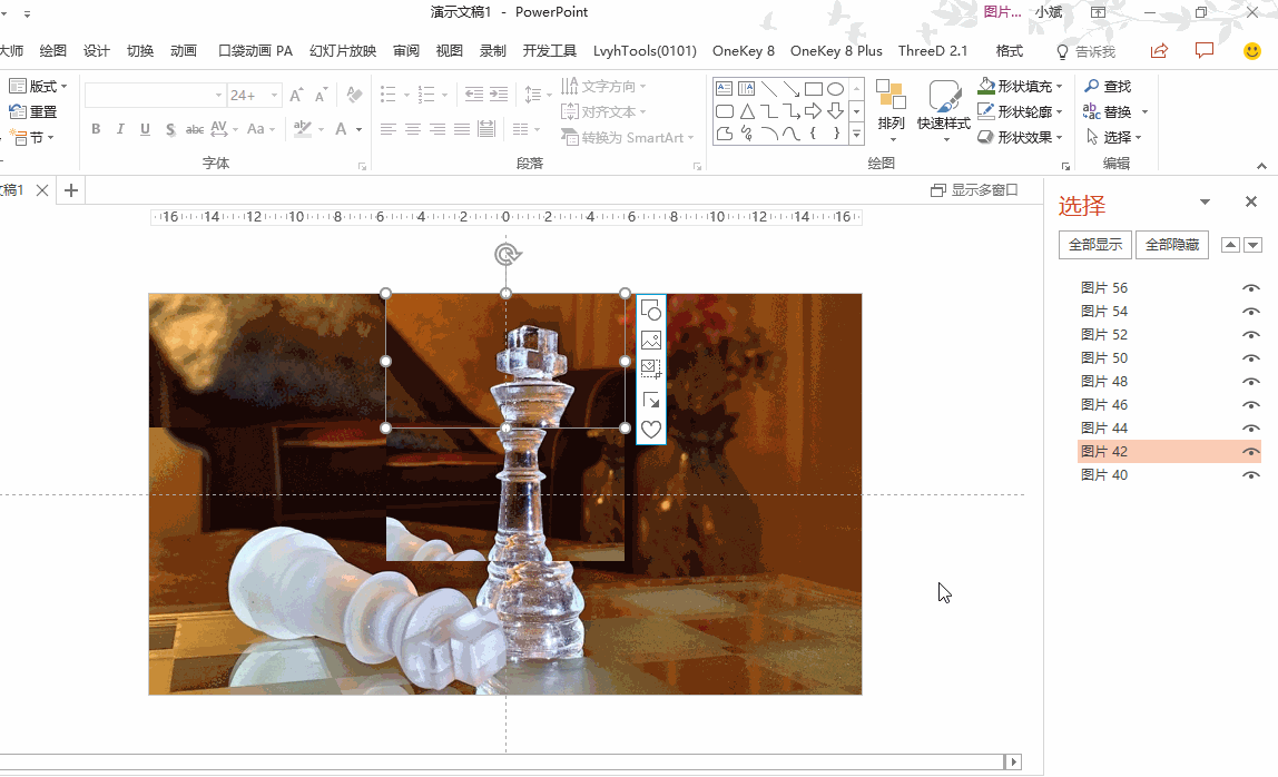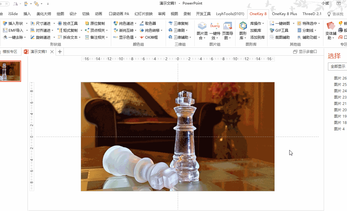 接下来复制图片,再复制出8张图片,要保证图片对齐。因为一般的复制粘贴是会发生位移的,所以这里我用OK插件的【原位复制】功能,选择图片后,通过点击「OK插件→原位复制」就可以快速复制出一张图,并与原图位置一致;同理,我再复制出7张图。