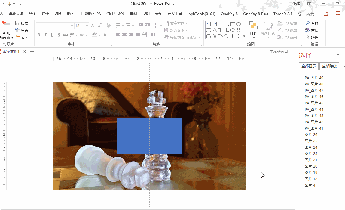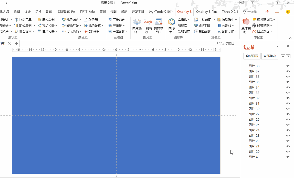 首先插入一个全屏矩形,这使用OK插件就比较方便。选择刚好铺满幻灯片的图片,通过「OK插件→插入形状」,既可插入一个等大小的矩形;也可以通过「OK插件→插入形状下拉箭头→全屏矩形」,来插入一个全屏矩形。