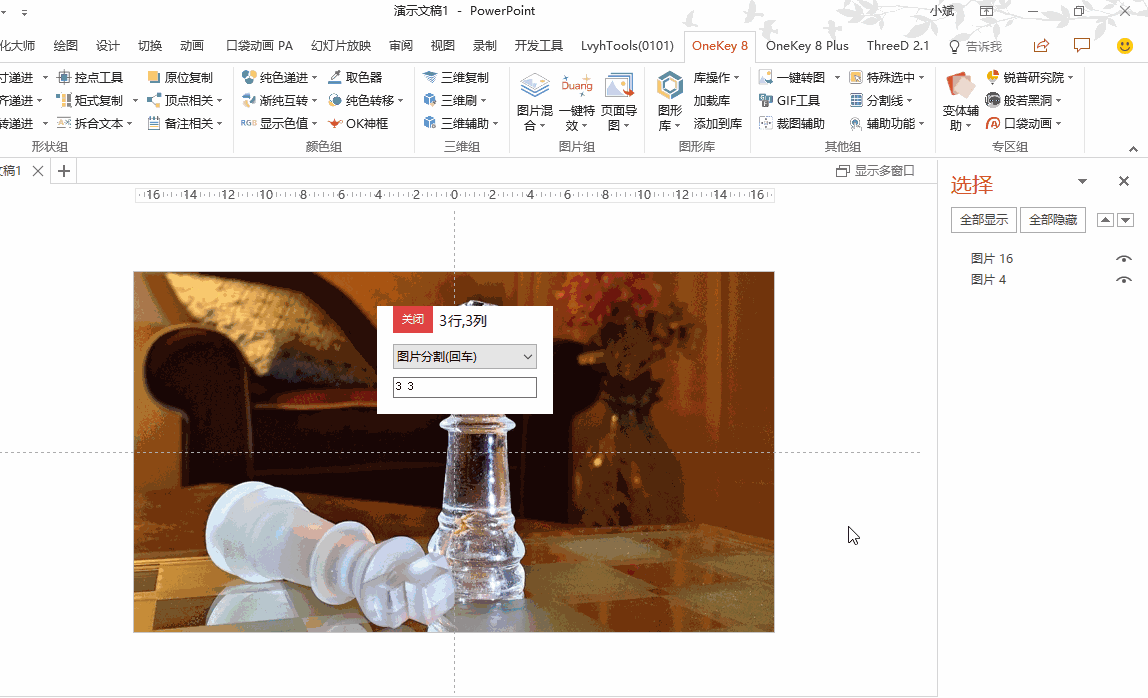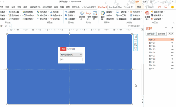 用快捷键「Alt F10」调出【选择窗格】,在选择窗格中依次选择一张图片和一个小矩形(顺序不能乱),通过「OK插件→变体辅助→形状裁图2」,就可以获得矩形所占位置的裁图;把九个组合都裁完后,就做出了九张小图,九张小图也构成一幅大图。