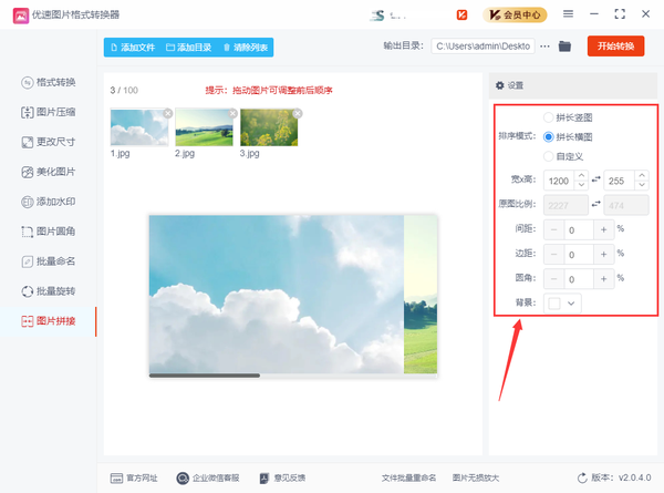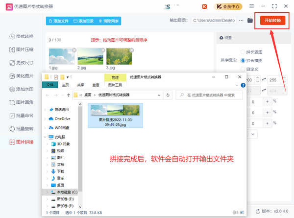 4、参数设置完成后即可点击【开始转换】按钮合并图片了,拼接完成后,软件会自动打开输出文件夹,方便用户及时查看合并后的图片文件。