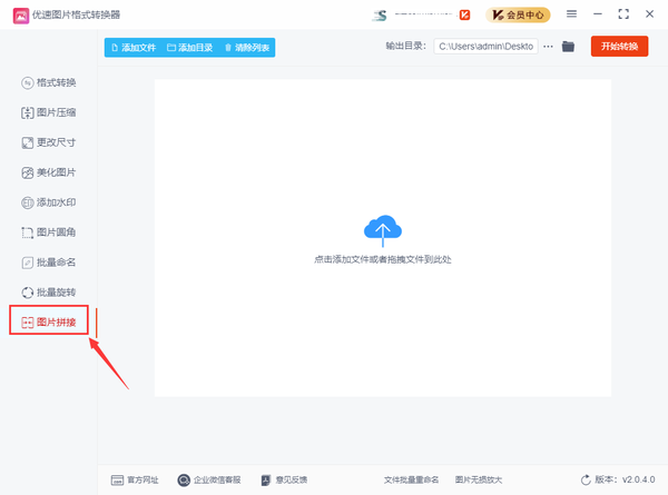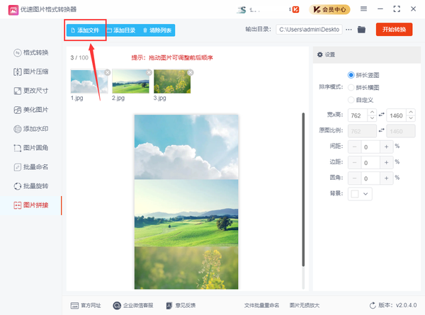 2、然后点击左上方的【添加文件】按钮上传需要拼接的图片到软件中,当然了,大家也可以用鼠标直接拖到软件里。如果对图片的前后排序不满意,我们可以通过拖动图片来调整拼接图片的左右顺序。
