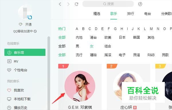 在QQ音乐馆,选中一位歌手,或者搜索一首歌曲。