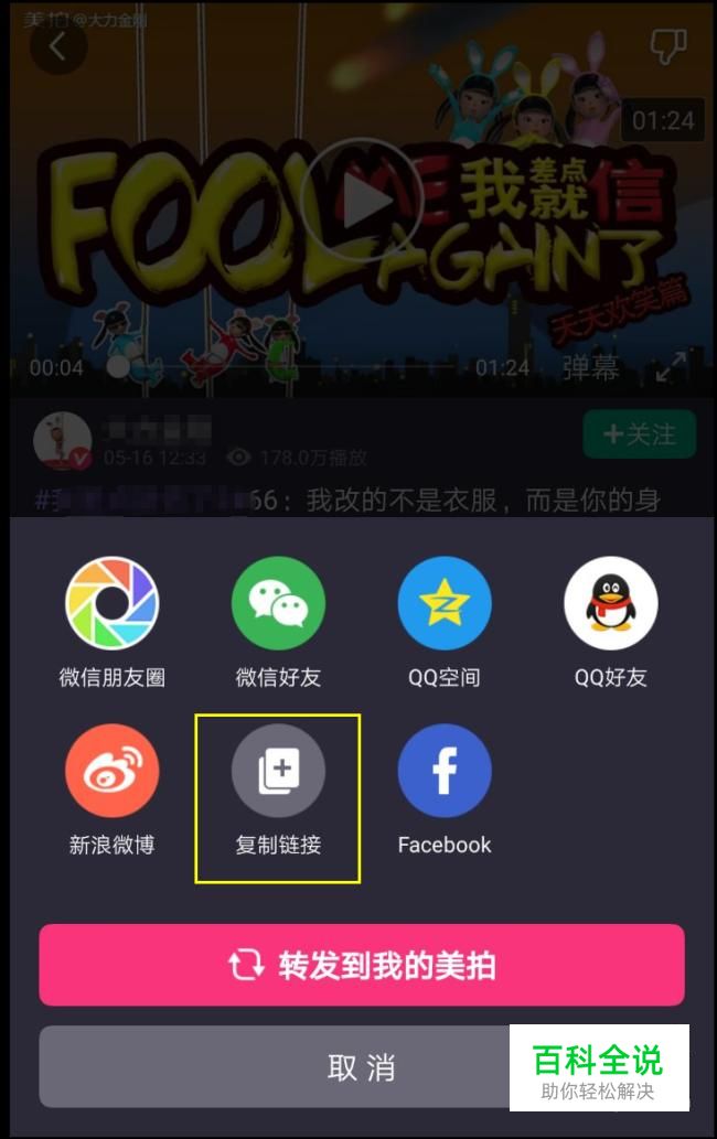 在美拍APP中,进入视频的播放页,点击 分享-> 复制链接。如下图所示: