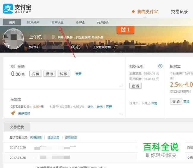 进入我的支付宝后,点击账户设置命令。如图所示: