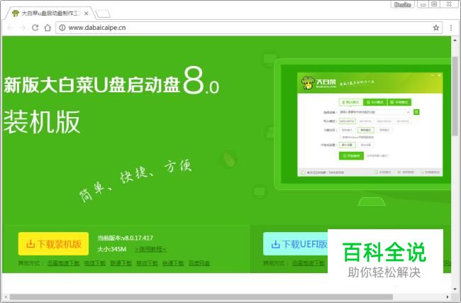 打开“http://www.dabaicaipe.cn”,下载“大白菜装机版”软件,将下载好的用系统文件用U盘制作成U盘启动器。