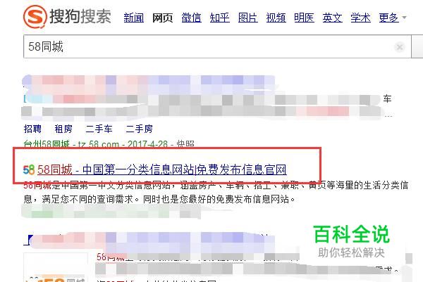 第一步打开搜狗搜索引擎,然后在搜索栏中输入“58同城”,接着点击搜索列表中的58同城官网,这样就能进入到58同城官网的主页中去了。