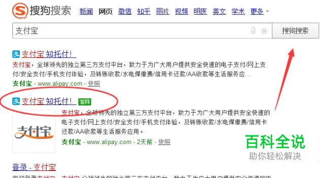 电脑打开浏览器,搜狗搜索支付宝,进入支付宝官网。