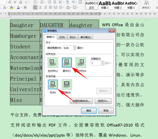 弹出表格属性的对话框,将表格的对齐方式设置为居中,然后在下面的文字环绕处,将环绕效果改为无,然后单击确定。