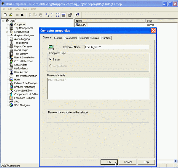 5. 运行WINCC,当打开更名之前正常的项目,现在出现提示:WINCC服务器不可用,证明前面修改已成功。然后按照通常移植 WINCC程序的方法,修改WINCC内的计算机名即可。 既在Wincc资源管理器--计算机--属性里的名称改成和电脑名字一样。