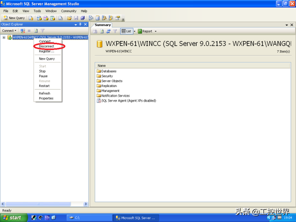 - 选择....\WINCC(SQL SERVER....,右键,如图所示,选择DisConnect..