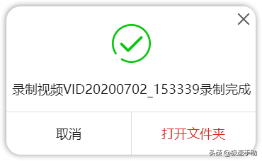 第八步,点击结束录制按钮之后,就会弹出一个小弹窗,显示已经录制完成,我们可以点击弹窗上的【打开文件夹】按钮,就可以预览刚才录制的GIF图片了。