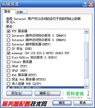 第2步,单击“高级”标签,在“高级”选项卡中单击“网络连接设置”区域的“设置”按钮,打开“高级设置”对话框。在“服务”列表中选取相应的服务复选框,并连续单击“确定”按钮使设置生效,如图2008112904所示。 图2008112904 “高级设置”对话框