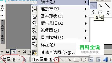 找到工具栏所处位置之后,在其右边有一个“自选图形”,点它右边的那小三角形,即可弹出菜单; 照菜单的说明,选择“线条”中的直线,在窗口使用左键拖一下,就画出直线了,如下图的“大众”两个字,就是直线画出来的;