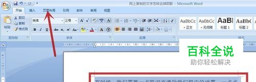 使用鼠标拖选要去掉阴影的文字(图中红框),再点击顶端的“页面布局”选项卡(图中红色箭头所指)