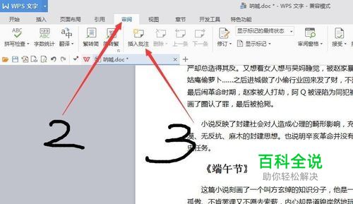 然后将光标定位到要插入批注的地方,然后点击上面的“审阅”,在其子功能栏中选择“插入批注”按钮。