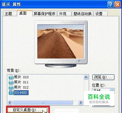 在桌面空白区域单击右键 → “属性” → “桌面”选项卡 → “自定义桌面”