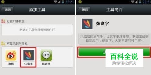 然后在弹出的添加工具中,即可看到我们开始在手机中安装的“炫彩字”微信插件了,我们选择它,然后在接下来的操作中,选择“加到附件栏”中,如下图所示: