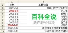 有些工作是需要在周休日开展的,如果能把所有的周休日都醒目地标识出来,就能够避免一些时间安排上的问题了。使用条件格式可以方便地实现这个要求,方法如下。 单击A2并拖动光标到A17以选定区域A2:A17,单击菜单“格式”→“条件格式”。 在“条件格式”对话框中,单击“条件1(1)”的下拉箭头,在列表中选择“公式”项,在右边的文本框中输入公式: =WEEKDAY(A2,2)>5 单击“格式”按钮,在“单元格格式”对话框的“字体”选项卡中选择“字形”为“加粗”,颜色为红色,单击“确定”按钮。 单击“条件格式”对话框的“确定”按钮。