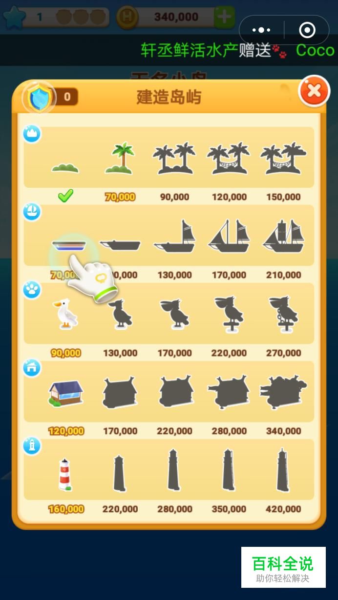 点击中间的小锤子,就会出现一些植物和用具,会根据你的金币来选择修建的东西,就可以修建小岛了。