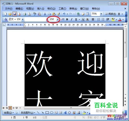 方法一、选中需要放大的字,然后在“格式”工具栏中的“字号”里面输入72以上的数字,比如这里我输入“150”,然后按“回车键”,这时字体立马变成150字号的超大字体。(如下图,在红色线内输入想要的字号)
