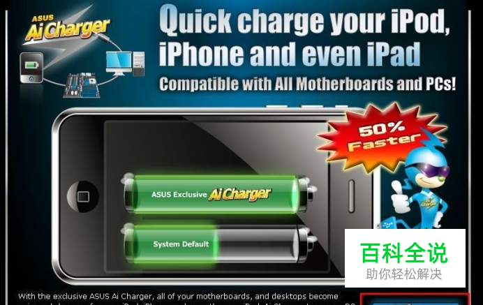 iPad充电充不进,怎么办?如何给iPad充电? iPad连接PC USB充电时显示“没有充电”,很多iPad用户对这个问题都很困扰。因为电脑USB2.0的供电规格是:电压5V,电流上限0.5A,最大功率2.5W,而iPad自带的充电器是5.1 V和2.1 A的,达不到充电标准,所以iPad通过数据线接入PC时显示不能充电的。但是如果连接的是苹果电脑,是可以直接充电的。那只有PC,该如何帮iPad充电呢?一款名为“Ai Charger”的程序,可以支持iPad在普通PC上充电,ASUS出品, QQ截图20110915180353.png(118.4 KB,下载次数: 946) 下载附件 2011-9-15 18:04上传 下载安装了Ai Charger之后,重启电脑。重启之后,任务栏会出现一个类似于充电器的“Asus Ai Charger”图标。再将iPad连接到PC上,就可以开始充电了。