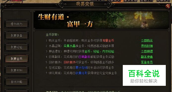 有钱能使鬼推磨,没钱的日子真难过!在9377赤月传说2里想要变强你就得有钱,别以为这是网页游戏就不用努力了,不努力是没有肉吃的。当然了小编这里指的“钱”是游戏中的金币,这钱在游戏里可大有用处,想知道赤月传说2怎么赚钱快吗?来看看赤月传说2快速赚钱方法吧! 和现实不同,现实赚钱又累又辛苦,而在赤月传说2赚钱就是一件又好玩又有趣的事儿,小编为大家总结了一下赤月传说2快速赚钱攻略,七个小方法让你赚个金钵满盆。来看看都是哪些赚钱方式吧! 1.水晶盗贼:采集水晶换金币、水晶纯度越高奖励就越丰厚。 2.押送镖车:千里走镖押镖成功可同时获得金币、经验、内功经验等奖励。 3.日常副本:每次通关完成一个日常副本都可以获得相应的金条奖励。 4.回收饰品:回收饰品可以获得大量金币,饰品级别越高金币奖励越多。 5.在线奖励:角色在线就可以赚钱,只要角色每日在累计在线时长达标就可获得相应的金条奖励。 6.绑元商城:只要完成每日的收集任务你就可以获得绑定元宝,绑定元宝可以在绑元商城里兑换成金条哟! 7.商城购买:如果你是土豪又嫌以上方式赚钱太麻烦,你可以直接在元宝商城里购买金盒、金条等物品,使用后同样可以获得大量金币。