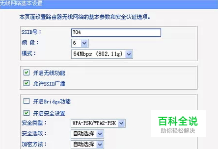启用后会看到下面需要填写WPA/WPA2的相关信息,此时密码类型选择最高安全级别的AES,另外在网络密钥处填写您要设置的密码,密码要求8-63位ASCII,也就是说您填写8位以上的字母、数字或者特殊字符均可以,密码复杂度越高,破解起来就更加的困难。其余选项保持默认状态。
