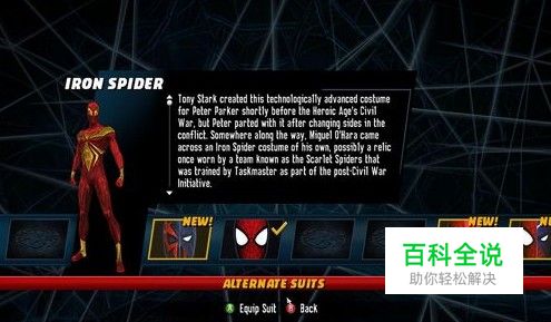 作弊码——服装解锁(PC,PS3,Xbox360版适用) Iron Spider 服装 在主菜单, 按 上, 右(3次), 左(3次), 下, 上 即可解锁 Iron Spider 服装(2099维度)