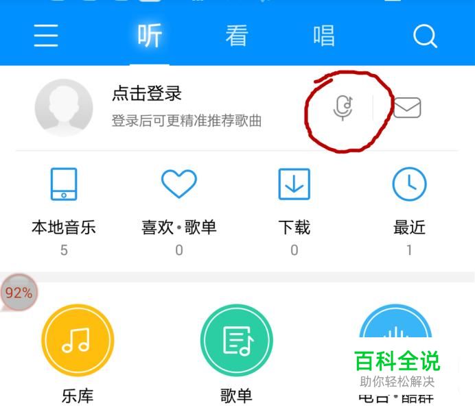 打开酷狗音乐,在主界面上部有个小麦克风,点一下。