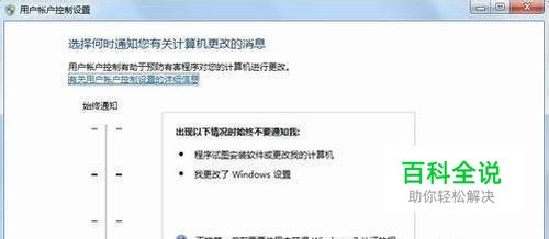 2.将用户账户控制设置中的通知条件调节到最低的“从不通知”来关闭UAC。