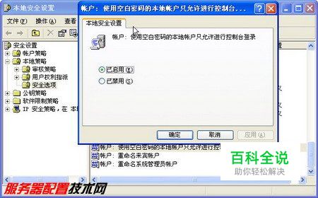 第2步,设置本地账户安全策略。依次打开“开始”→“所有程序”→“管理工具”→“本地安全策略”目录,打开“本地安全设置”窗口。在左窗格中依次展开“安全设置”→“本地策略”目录,并中“安全”选项。然后在右窗格中找到并双击“使用空白密码的本地账户只允许进行控制台登录”选项,选中“己禁用”单选框并单击“确定”按钮。如果允许空白密码访问,并且每个登录用户都设置有密码,可不执行该操作,如图2008121503所示。 图2008121503 设置本地账户安全策略