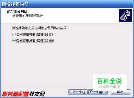 第3步,在桌面上右键单击“我的电脑”图标,选择“属性”快捷命令。在打开的“系统属性”对话框中切换至“计算机名”选项卡。然后依次单击“网络ID”→“下一步”按钮;选中“本机是商业网络的一部分,用它连接到其它工作者的计算机”单选框,并单击“下一步”按钮;选中“公司使用没有域的网络”单选框并依次单击“下一步”→“完成”→“确定”→“是”按钮。重新启动计算机使设置生效,如图2008121504所示。 图2008121504 选择网络类型