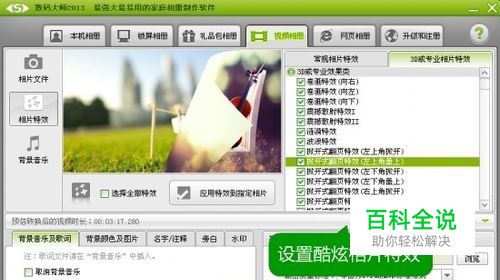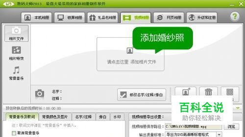 添加背景音乐,插入动感歌词字幕 浪漫的婚纱照视频,怎么能缺少动听的背景音乐呢?点击“背景音乐”选项卡,为视频添加音乐和LRC歌词。我们还可以根据下图的指示,设置MTV歌词字幕特效,制作类似MV视频的动感歌词效果。