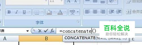 点击B2,在上方的函数中输入=concatenate(A1, A2,A3,A4),如下图: 注意文本字符串之间是用逗号隔开的!