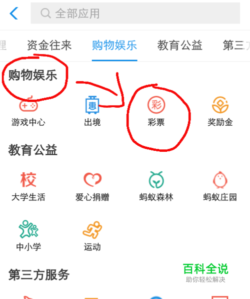 在购物娱乐里找到彩票,点击进入蚂蚁积分兑换彩票