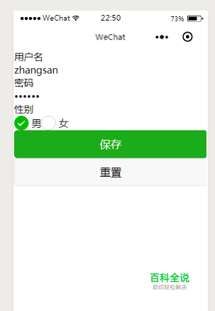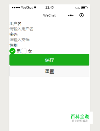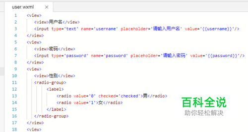 第四步,在user.wxml中,添加用户名、密码、性别、保存按钮和重置按钮元素,如下图所示: