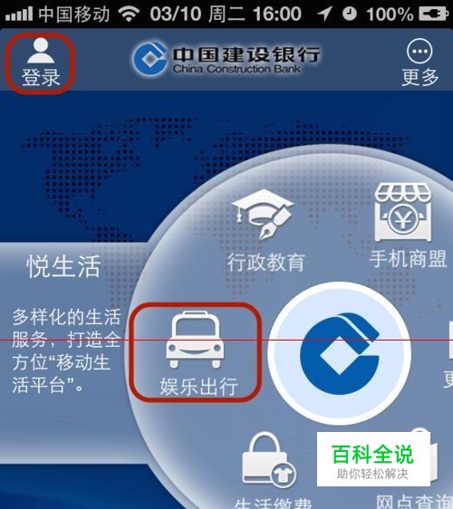 1、进入建设银行手机端,首先登陆。点击界面下方的【悦生活】。点击界面中间部分的【娱乐出行】。