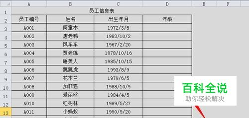 建好表格 打开一个excel表格,录入员工的编号、姓名、出生日期等基本信息,并预留一列作为年龄的计算列(将表头建好),但是如果需要登记的信息比较多的话,也可以将如性别、岗位、入职时间、职务、政治面貌等信息录入。总之,不管怎么设计,至少要包含姓名、出生年龄这两项内容。