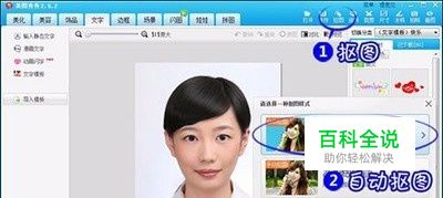 用“美图秀秀”打开一张图片,单击右上角的“抠图”并选择“自动抠图”功能