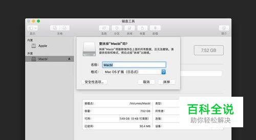 3、格式化U盘 备份完毕后,将U盘插入电脑,在【磁盘工具】的外置一栏中选择你需要制作系统的U盘,点击上方【抹掉】,命名为Macbl,点击【抹掉】格式化U盘。