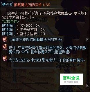 我们65级时,开启外传任务佩戴魔法石的资格。 此时我们只要在任务栏中接受外传任务——穿戴辅助装备的资格即可。 任务需求: 击败根特南门(位于天界安特贝鲁峡谷)地下城的3个怪物: GT-9600、眩击枪杰娜、巨枪多里安
