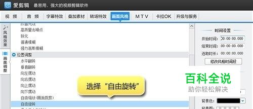 添加视频,调正视频画面 很多人在用手机、摄像机拍摄视频时,由于不注意手握方向,把视频拍倒了,这时我们可以使用爱剪辑,一键调正视频。先点击“添加视频”按钮,将视频一次导入爱剪辑中。接着在“画面风格”左栏的“画面调整”,点击“自由旋转”,在“角度”一栏设置参数,譬如:90,-90等。你可以根据画面情况自由设置,并点击“添加风格效果”按钮,为视频应用就行了。