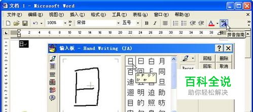 MS Windows xp中的日语输入法 安装:打开“控制面板\区域和语言选项\文字服务和输入语言”,单击“添加”,在“输入语言”中选择日语,再单击两次“确定”即可。 示例:查“日”字的读音。 1.切换到日语输入法; 2.单击输入法状态条上的“IME Pad”按钮(长得像笔筒),在弹出的菜单中单击“Hand Writing”以调出输入板; 3.单击输入板上的“Clear”按钮以清除“宀”; 4.拖动鼠标在左边的书写窗口写个“日”,右边侯选窗口里会动态地列出候选字; 5.将鼠标停在“日”字上就可以看到“ニチ”、“ジツ”等假名注音了。 贴士:也可以单击输入板左侧“部”、“画”按钮来按部首或笔画查找汉字。